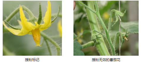 当熊蜂访番茄花时,会使用前额将自己固定在花朵上,因此会在花柱上留下棕色的印记(称为“吻痕”)这是识别熊蜂授粉的主要标记。熊蜂刚授粉后吻痕很轻,不容易分辨,随着时间的延长吻痕面积会逐渐扩大,颜色变深,授粉24~36小时后吻痕已比较明显,容易观察识别。熊蜂一次访花就可以产生良好的授粉效果。熊蜂授粉3~5天后,番茄花瓣会逐渐闭合、萎蔫与柱头一起脱落。70%以上的花出现褐色吻痕可界定为蜂群正常访花。